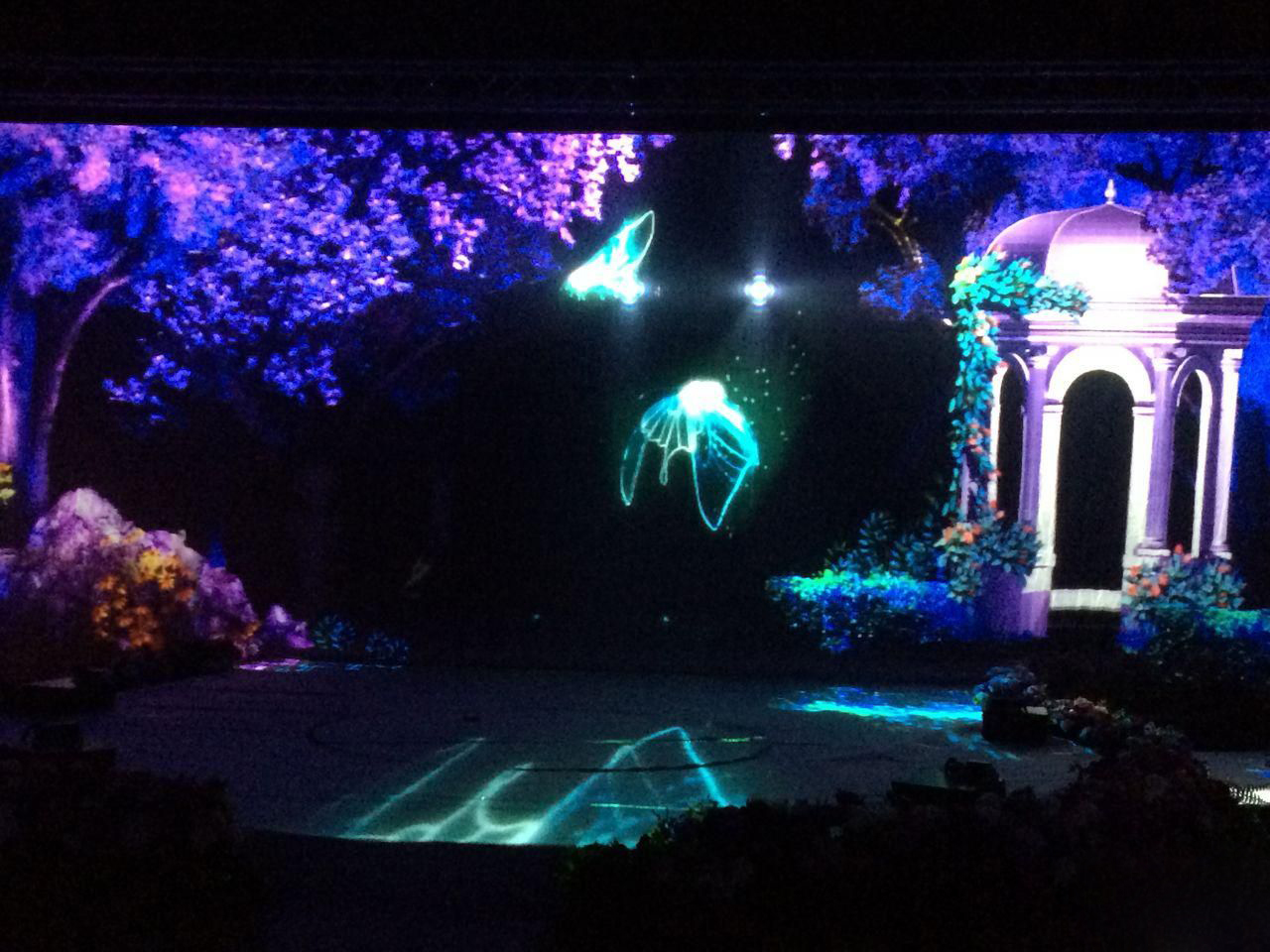 3D全息投影是一种利用干涉和衍射原理记录并再现物体真实的三维图像,是一种无需配戴眼镜的3D技术,观众可以看到立体的虚拟人物。该技术在2012年龙年春晚中被大量使用,如杨丽萍表演《雀之恋》时,花瓣散落和蝴蝶飞舞都是用高科技的舞台全息技术制造的虚幻景象,超越了传统投影无法达到的效果,画质清晰度和逼真度都非常高。